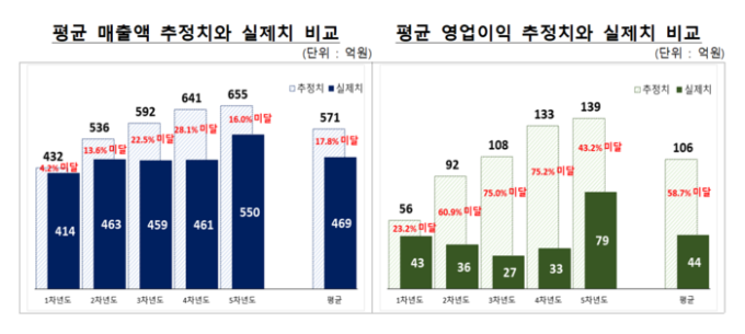 매출액 미달 기업 비중과 영업이익 미달 기업의 비중은 각각 평균 76%, 84.1%에 달했다. 추정 연차가 높아질수록 미달 기업의 비중은 증가하는 경향이 있었으며 장래 영업환경 등을 지나치게 낙관적으로 전망해 영업실적을 추정한 사례들이 있었다.