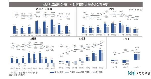 3세대 실손보험만 손해율이 악화된 것은 아니다. 4세대 실손보험 손해율 역시 작년 89.5%에서 올해 115.9%로 올랐다. 1세대 손해율은 작년 124.9%에서 올해 121.5%로, 2세대는 작년 111.5%에서 올해 110.7%로 점차 안정화되는 추세인 것과는 정반대다.