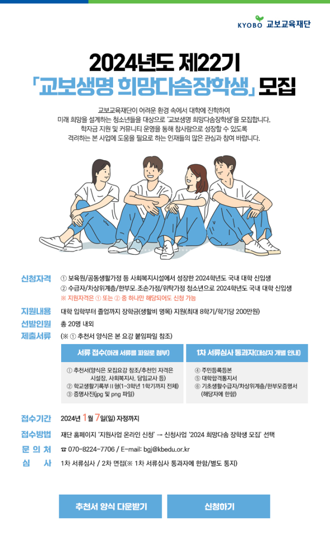 희망다솜장학금 신청 대상은 전국의 보육시설 및 그룹홈, 저소득층 가정의 청소년으로 2024학년도 대학 신입생이다. 장학생 선발과 관련한 자세한 내용은 재단 홈페이지를 통해 확인이 가능하다.