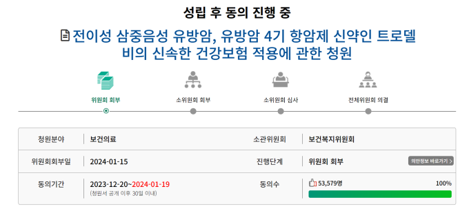 16일 삼중음성유방암 치료제 ‘트로델비’(성분명 사시투주맙 고비테칸)의 건강보험 적용을 촉구하는 국민동의청원 청원 글이 동의 수 5만3000여명을 기록했다. 해당 사안은 국회에 회부될 예정이다.