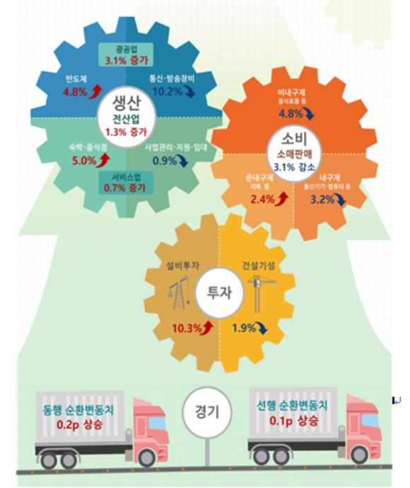 전산업 생산은 작년 11월 0.3% 증가세로 돌아선 이후 12월(0.4%)과 1월(0.4%), 2월(1.3%)까지 4달 연속 증가했다.