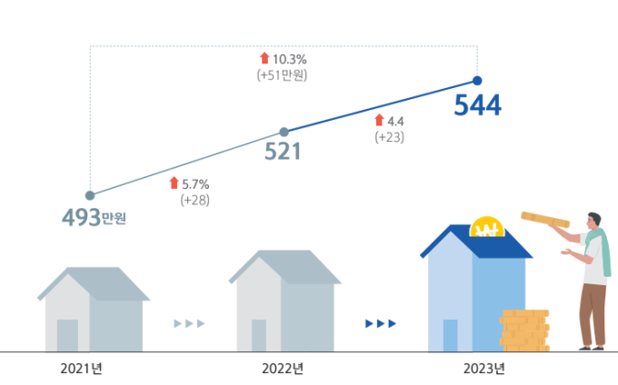 지난해 한국 보통 가구는 월평균 544만원을 벌어 9.9%인 54만원을 빚 갚는데 쓴 것으로 나타났다. 가구 내 평균 보유 자산은 조사 이래 최초로 6억원을 돌파했다. 고물가 영향으로 기본 생활비인 식비, 교통비, 월세 만으로도 전체 소비 절반을 넘는 것으로 조사됐다.
