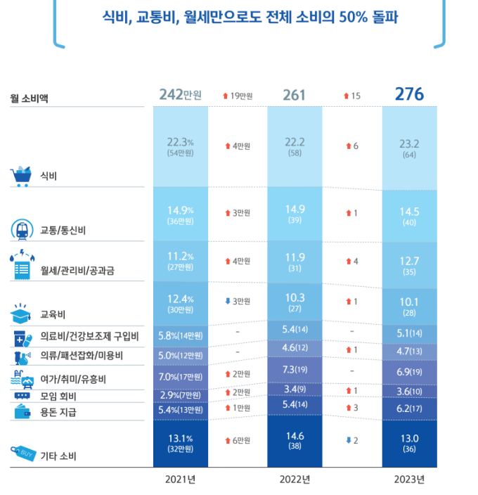 고물가 영향으로 생활비인 식비, 교통·통신비, 월세·관리비·공과금 지출이 139만원으로 월 소비액(276만원)의 과반을 차지했다.