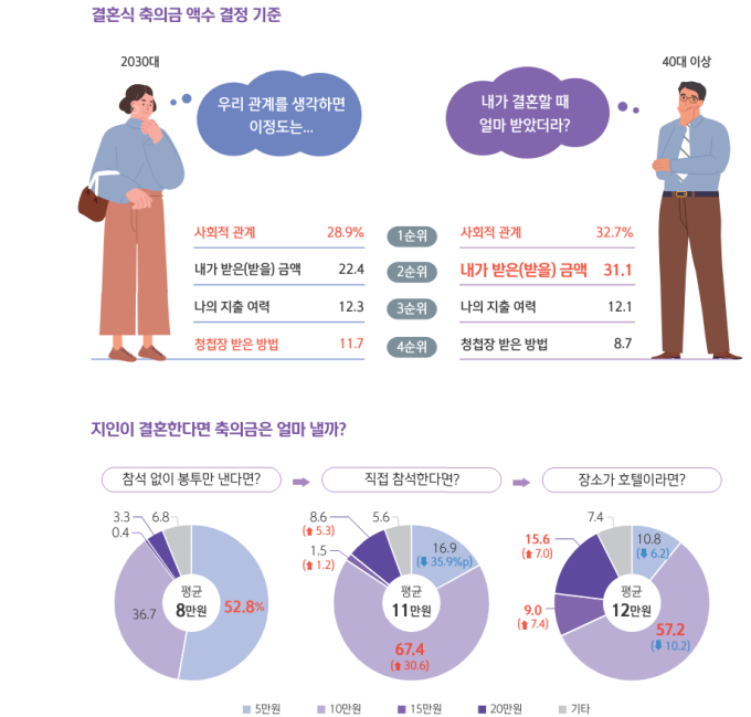 2030대는 경조사로 챙겨주는 액수보다는 참석 자체에 의의를 두고 있었다. 40대 이상은 적은 금액을 낸다면 참석하기보다는 봉투만 내는 것이 낫다고 생각했다. 모든 연령대에서 결혼식 축의금 액수는 사회적 관계를 생각해 결정한다고 응답했다. 2030대는 청첩장을 받은 방식에 따라, 40대 이상은 내가 받은 금액만큼 내겠다고 응답한 비율이 높았다. 축의금에 대해서는, 참석 없이 봉투만 낸다면 평균 8만원을, 직접 참석한다면 평균 11만원을, 결혼식 장소가 호텔이라면 평균 12만원을 낼 의향이 있는 것으로 조사됐다. 축의금 또한 인플레이션 추세를 보였다.