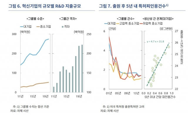 보고서에 따르면 한국 기업의 R&D 지출 규모(2022년 기준 GDP의 4.1%)와 미국 내 특허출원 건수(2020년 기준 국가별 비중 7.6%)의 세계 순위는 각 2위, 4위에 이른다. 하지만 한은 분석 결과 기업의 생산성 증가율은 2001~2010년 연평균 6.1%에서 2011~2020년 0.5%까지 크게 낮아졌다.