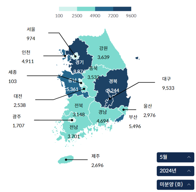 경북도(-10.36%)와 경기도(-6.16%)⋅충남도(-5.9%) 순으로 하락률이 높았다. 전국 1위인 대구(9533호, -1.39%)에서도 미분양 주택이 줄었다.
