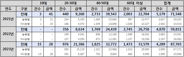 국회 농림축산식품해양수산위원회 소속 더불어민주당 윤준병 의원이 국정감사를 앞두고 농협중앙회로부터 제출받은 ‘최근 3년간 연도별 연령대별 보이스피싱 피해발생 현황’ 자료에 따르면, 2023년 30대 이하 농협 이용객의 보이스피싱 피해 건수는 총 991건으로, 전년도 356건과 비교하면 1년 사이 3배가량 뛰었다. 피해 금액은 총 214억1400만원으로 당해연도 농협 보이스피싱 전체 피해 금액의 24.4%를 차지했다. 2021년의 13%와 비교하면 10%p 이상 증가한 수치다.