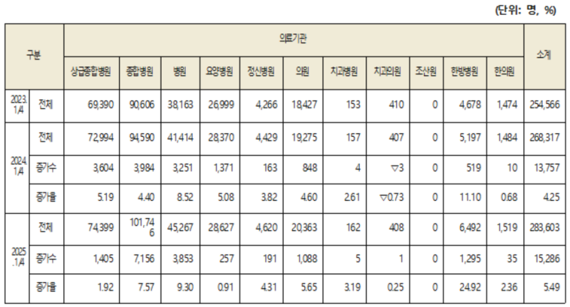 특히 상급종합병원의 간호사 채용 증가폭이 현저히 줄었다. 전공의 대거 이탈과 병원 재정 부담으로 인해 병원들이 신규 간호사 채용을 축소하면서 지난해 5.19%(3604명)였던 증가율은 2025년 1.92%(1405명)로 감소했다. 이는 전년 대비 약 61% 줄어든 수치다.