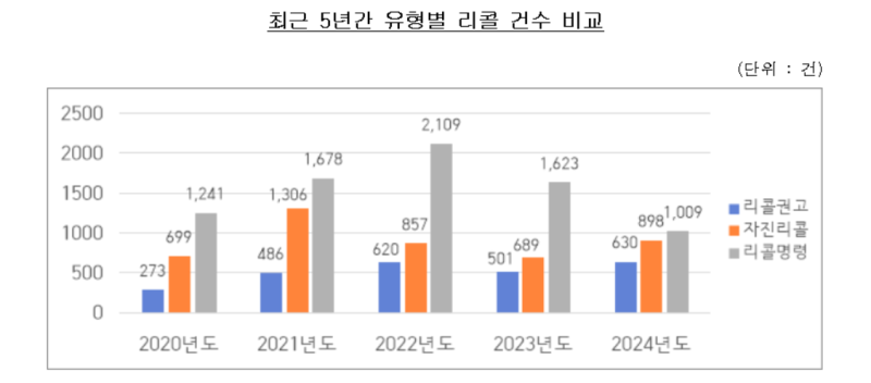 세부 유형별로 살펴보면, 리콜명령이 2023년 1623건에서 2024년 1009건으로 614건(37.8%) 감소했으나 자진리콜이 2023년 689건에서 2024년 898건으로 209건(30.3%) 증가하고 리콜권고도 2023년 501건에서 2024년 630건으로 129건(25.8%) 증가했다.