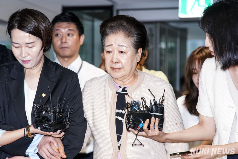 한 총재는 이날 오전 9시46분께 서울 종로구 KT광화문빌딩 웨스트에 마련된 특검 사무실에 도착했다. 베이지색 가디건 차림의 한 총재는 거동이 불편한 듯 동행자의 부축을 받으며 건물 안으로 들어갔다.