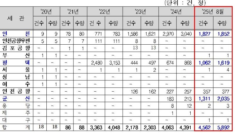 세관별로는 인천세관이 지난해 3040정에서 올해 1852정으로 줄어든 반면 평택세관은 868정에서 1619정으로 급증했다.