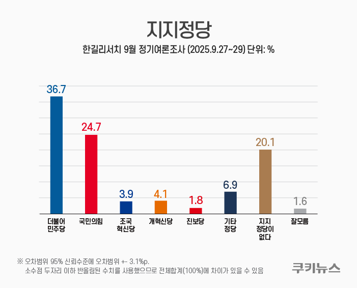이어 지지 정당 없음 20.1%, 기타 정당 6.9%, 개혁신당 4.1%, 조국혁신당 3.9%, 진보당 1.8%, 잘 모름 1.6% 순으로 나타났다.