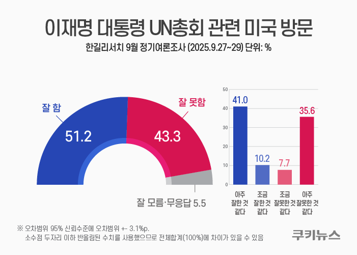 이재명 대통령의 국정수행 지지율이 50.1%로 집계돼 과반을 기록한 것으로 나타났다. 최근 미국 뉴욕에서 열린 유엔총회 참석에 대해서도 국민 절반 이상이 긍정적으로 평가했다.