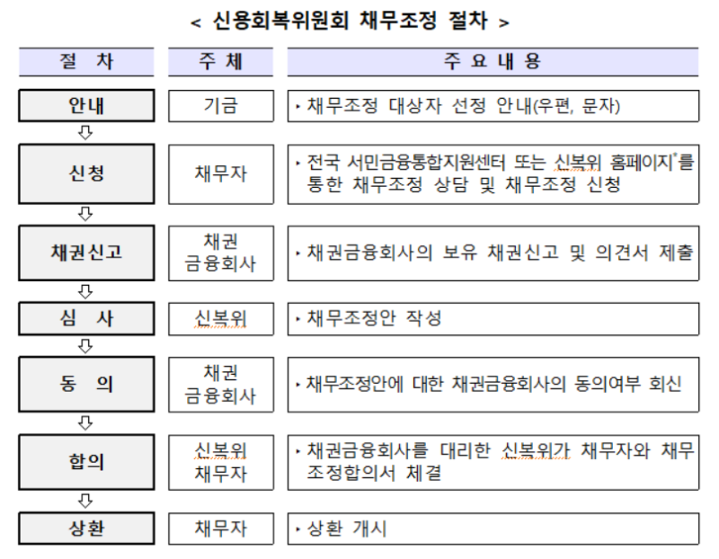 새도약기금이 협약에 참여하는 금융회사로부터 대상 채권을 일괄적으로 매입하기 때문에 채무자가 별도로 채무조정을 신청할 필요는 없다. 채무자는 금융회사가 새도약기금에 채권을 매각하는 시기와 새도약기금이 상환능력 심사를 완료한 때에 개별 통지를 받는다. 국민들은 새도약기금의 채권 매입 이후부터 새도약기금 홈페이지에서 본인 채무 매입 여부 및 상환능력 심사결과, 채권 소각 여부 등을 조회할 수 있다. 이 과정에서 사행성·유흥업 관련 채권, 외국인 채권은 제외된다.