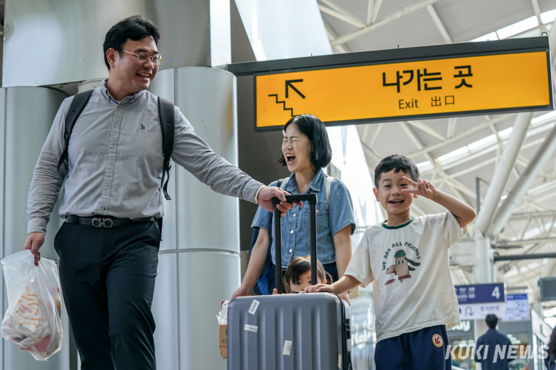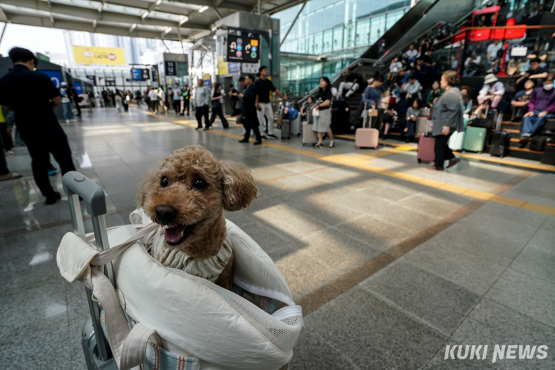 연휴를 하루 앞둔 2일 서울역 대합실은 캐리어를 끌고 승강장으로 향하는 시민들로 북적였다. 이들의 다른 손에는 추석 선물세트 등 추석 분위기를 내는 물건들도 넉넉히 들려 있었다. 가족 단위와 반려동물을 동반한 이용객도 늘어 ‘민족대이동’ 추석의 시작을 알렸다.