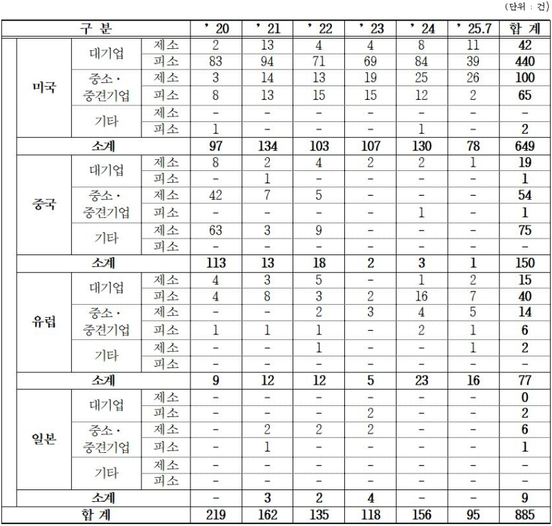 중견·중소기업을 포함한 국내 기업의 미국 내 피소는 507건으로, 유럽 46건, 일본 3건, 중국 2건에 비해 압도적으로 높았다.