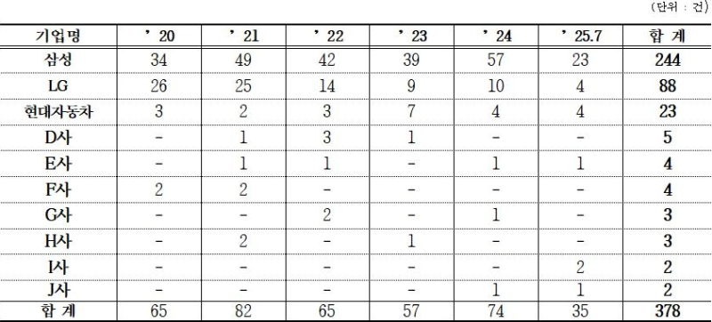 특히 국내 상위 10개 기업 사건은 총 478건으로, 삼성그룹 322건, LG그룹 100건, 현대자동차그룹 25건 순이었다. 나머지 4~10위 기업은 각각 3~9건으로 총 31건에 그쳤다.