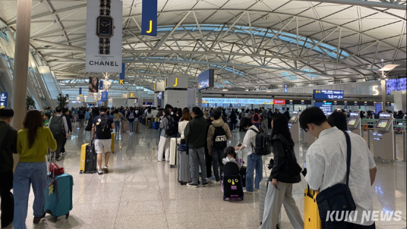 추석 연휴가 본격적으로 시작되기도 전인 2일 오전, 인천국제공항 제1터미널 출국장은 발 디딜 틈 없이 붐볐다. 공항철도 객차에는 28인치 캐리어 등 다양한 크키의 여행용 가방들이 빼곡히 들어차 있었고, 장기주차장까지 만차를 기록했다. 고향길 대신 해외로 향하는 발걸음이 공항 곳곳을 가득 메웠다.