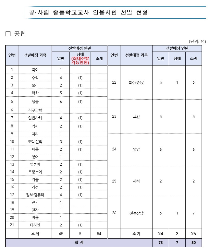 구체적인 선발규모는 공립 중등학교교사 26과목 80명, 사립은 20과목 91명이다. 공립의 경우 작년 45명 대비 35명이 증가했으며,이 중 장애구분모집 선발인원은 7명으로 교육부의 ‘장애구분모집총정원제’를 적용하여 선발한다.