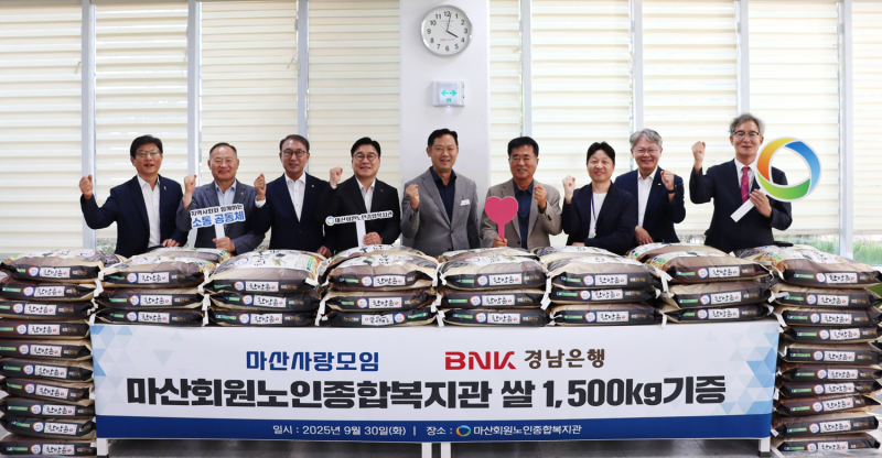 BNK경남은행이 추석을 맞아 마산회원노인종합복지관 경로식당에 쌀 1500kg을 기증했다. 이번에 전달된 쌀은 지역 취약계층 어르신들에게 무료 식사 제공에 사용된다.