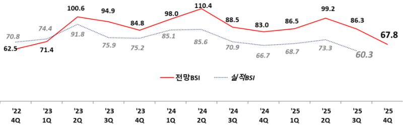 창원상공회의소(회장 최재호)가 발표한 ‘2025년 4분기 창원지역 제조업 경기전망지수(BSI) 조사’에서 121개 응답 기업의 전망 BSI는 67.8로 기준치(100)를 크게 밑돌며 부정적인 흐름을 보였다. 3분기 실적 BSI는 60.3이었다.