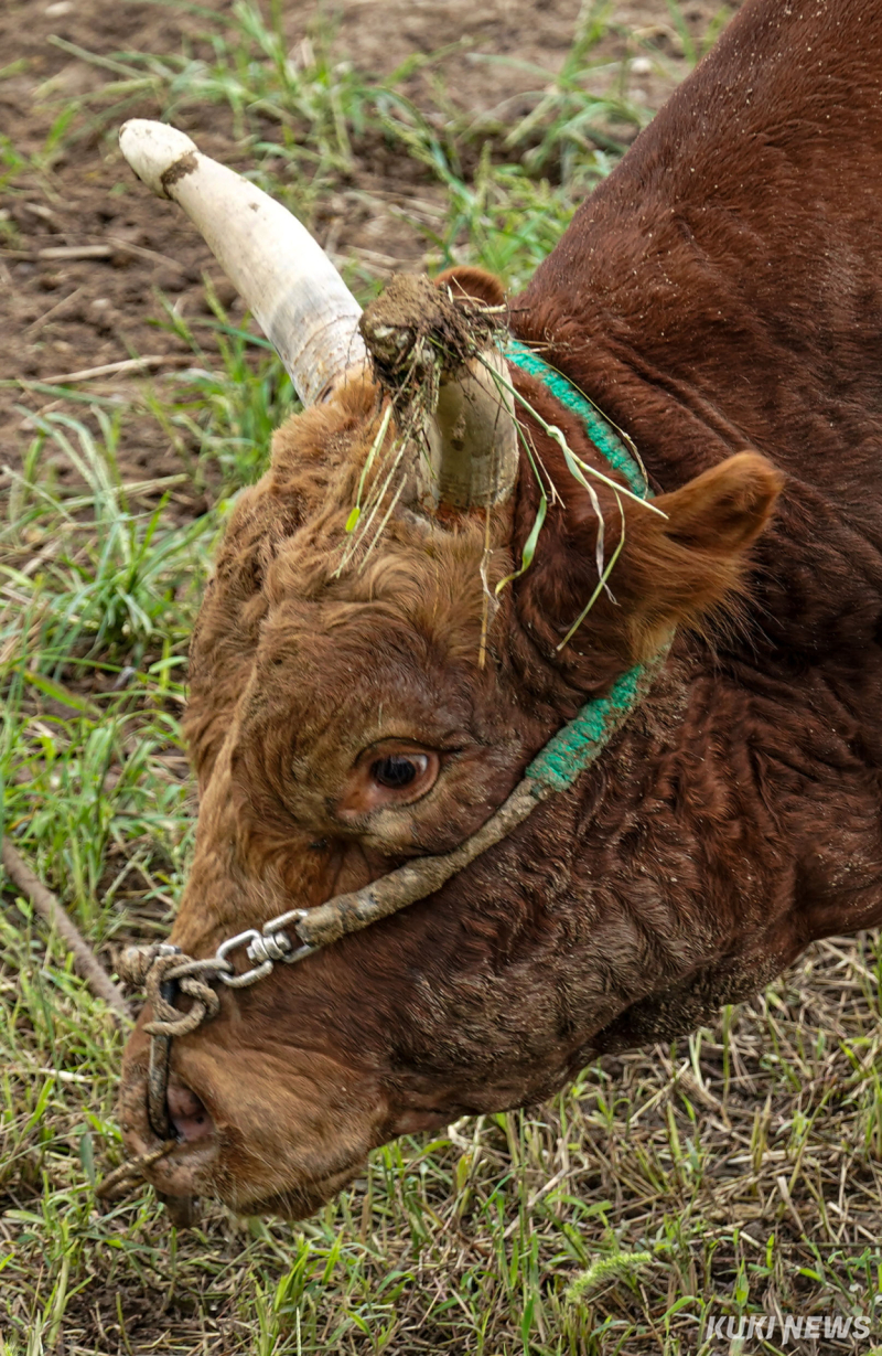 맏형 격인 ‘강투(13)’가 앞장서면 무리가 뒤따른다. 나무에 등을 문지르는 요령, 코뚜레 줄로 얼굴을 긁는 법을 어린 소들은 곁눈질로 배운다. 어느 순간, 고개를 지평선에 맞추고 앞발로 흙을 밀어올리며 리듬을 만든다. 발 구르기, 현장에서는 ‘뜰매질’이라 부른다. 거세하지 않은 수소가 힘을 과시하는 상징적 행위다.