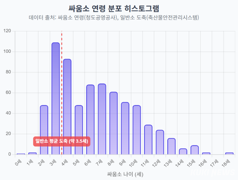 축산물안전관리시스템에 따르면, 작년 한 해 전국에서 도축된 비육우 111만 4715두의 평균 출하월령은 42.3개월이다. 대부분 소는 체성장이 한계에 닿는 48개월 이내에 생을 마감한다. 다른 길을 걷는 소도 있다. 올해 9월 기준 청도공영사업공사에 등록된 싸움소는 총 686두다. 이중 415두(60.5%)가 36개월 이내에 데뷔해 싸움소로 살아갈 기회를 얻었다. 10년 이상 현역인 개체도 136두(19.8%)에 달한다. 같은 3년을 기점으로 어떤 소는 삶을 정리했고, 어떤 소는 비로소 생을 준비했다.