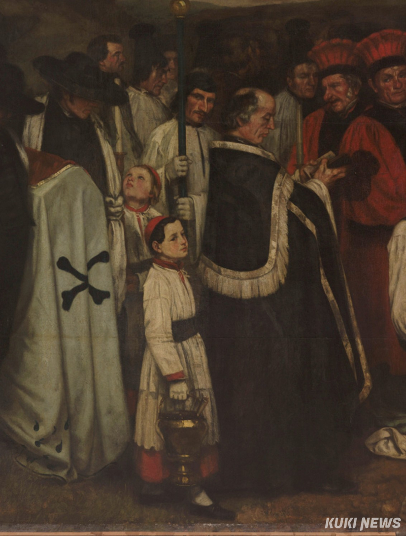 스운구인들 옆에는 날카로운 눈초리로 관람자와 시선이 마주치는 십자가를 든 사람과 복사들이 있다. 앞에 선 소년은 향로를 들고, 다른 소년은 촛대를 들고 있는데 운구하는 남자와 눈을 마주치며 무척이나 지루한 모양이다.