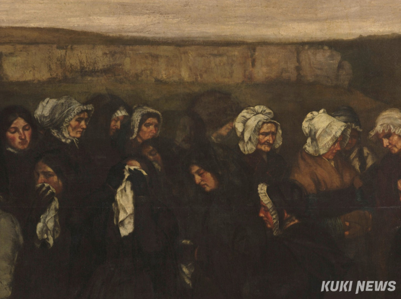 화폭 왼쪽부터 자세히 살펴보자. 검은 옷을 입고 모자를 쓴 이들이 관을 운구하고 있다. 십자가가 새겨진 흰 천으로 관은 완전히 덥혀 있고, 배경에는 쿠르베의 고향인 오르낭의 백악 절벽이 보인다.