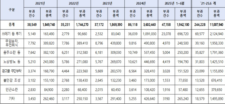 이에 따른 범칙금 부과 총액도 2021년 18억4974만원, 2022년 17억4427만원, 2023년 18억6939만원에서 지난해 36억244만원으로 급증했다. 2025년 6월 말 기준으로는 19억4210만원을 기록 중이다.