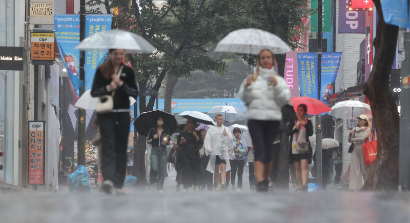 28일 비가 내리는 서울 중구 명동거리에서 시민 및 외국인관광객들이 우산을 쓴 채 걸어가고 있다. 연합뉴스