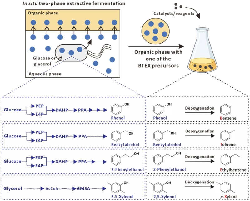 KAIST 생명화학공학과 이상엽 특훈교수와 화학과 한순규 교수 공동연구팀은 미생물 발효 공정과 화학 반응을 결합해 포도당, 글리세롤 등 재생 가능한 바이오 원료에서 BTEX를 생산하는 새로운 화학생물학적 공정을 개발했다.