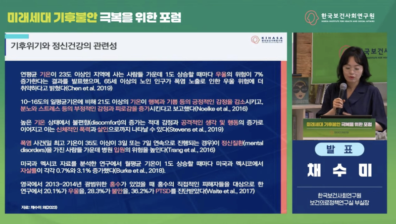 채 부실장은 특히 국가와 지역 사회의 역할을 강조했다. 그는 “국민이 기후행동에 적극적으로 참여할 수 있도록 일관성 있는 기후 대응 정책을 마련해야 한다”고 강조했다. 또 “기후불안의 부정적 영향을 최소화하기 위해서는 지속적인 모니터링과 평가가 필요하다”고 덧붙였다.