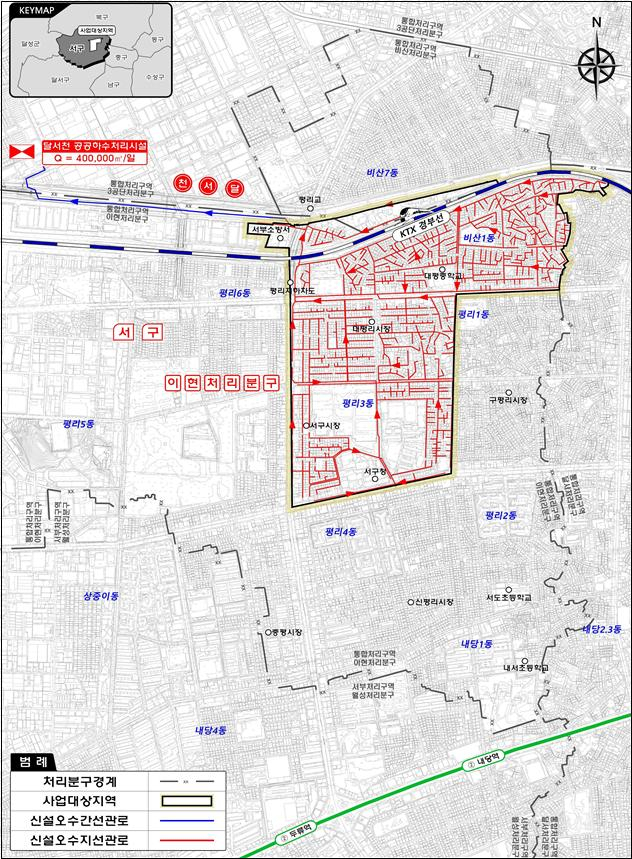 달서천 1구역 사업은 서구 비산동과 평리동 일원에 총사업비 861억원을 투입해 37㎞의 오수관로를 신설하고, 3709가구의 배수 설비를 정비하게 된다. 대구시 최초의 우·오수 분류화 BTL 사업으로, 향후 추진될 2~5구역 사업의 선도 모델로 평가된다.