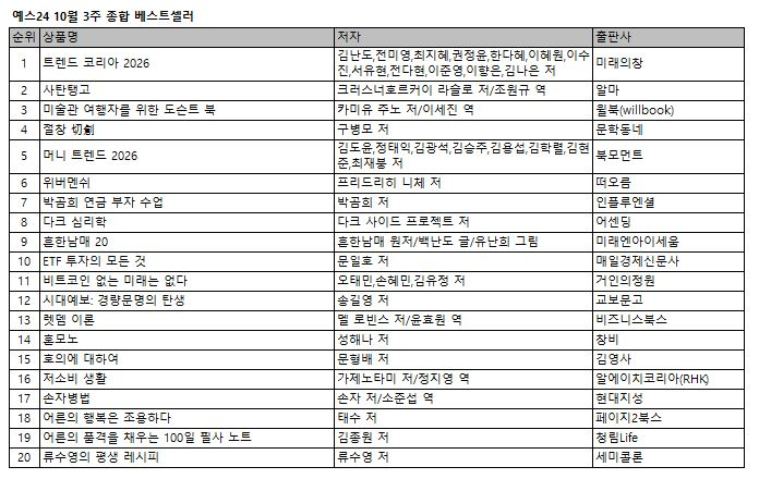 예스24는 10월 3주 종합 베스트셀러에서 대한민국 대표 트렌드 전망서 ‘트렌드 코리아 2026’이 3주 연속 종합 1위에 올랐다고 16일 밝혔다.