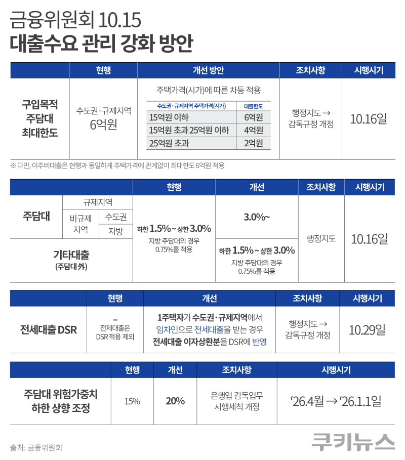 16일 금융권에 따르면, 정부는 6·27 대책에 이어 한층 강화된 대출 규제를 시행한다. 수도권 및 규제지역 내 주담대 한도는 주택 시가에 따라 △15억원 이하 최대 6억원 △15억~25억원 4억원 △25억원 초과 2억원으로 축소된다. 스트레스 금리 또한 기존 1.5%에서 3%로 상향 조정된다.