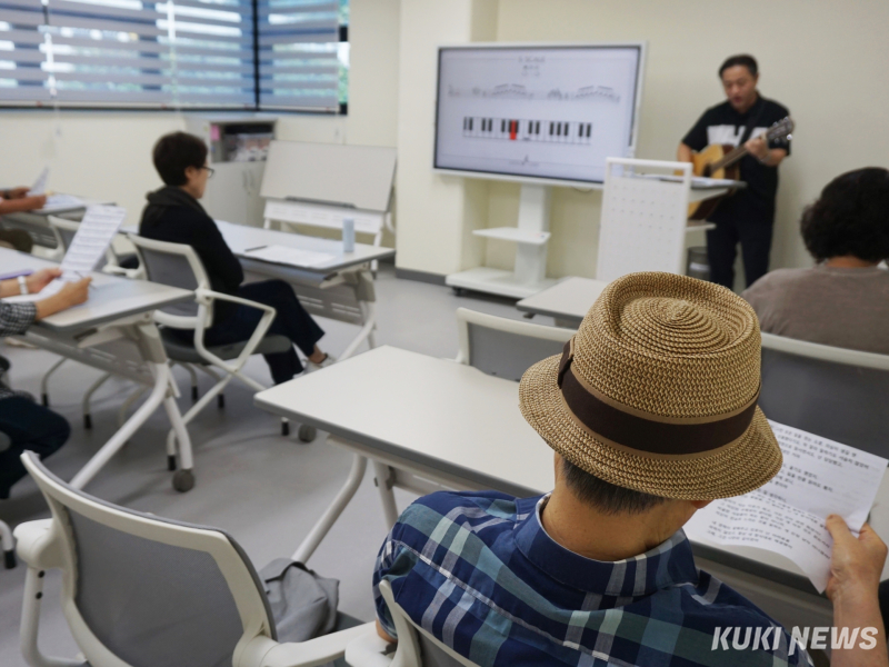 16일 오전 서울 강동구 강동시니어문화센터. 3층 강의실 책상 앞에 앉은 9명의 수강생이 악보를 쥔 채 고개를 끄덕였다. 기타 반주를 따라 울려 퍼지는 비틀즈의 노래 ‘예스터데이(Yesterday)’가 강의실을 가득 메웠다. 모든 수강생이 60세를 넘겨 노년기로 접어들었는데도 목소리는 힘차고 활기가 넘쳤다. 어린 시절 즐겨 부르던 세계적 히트곡은 어느덧 올드 팝송이 됐지만, 노래를 즐기는 마음은 그때나 현재나 다르지 않다.