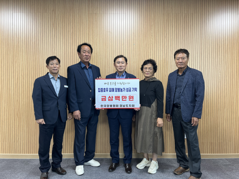 한국양봉협회 경남도지회(회장 정현조)는 16일 합천군(군수 김윤철) 농업기술센터(소장 이동률)를 방문해 지난 7월 집중호우로 피해를 입은 한국양봉협회 합천군지부 회원들을 돕기 위해 성금 300만원을 기탁했다.