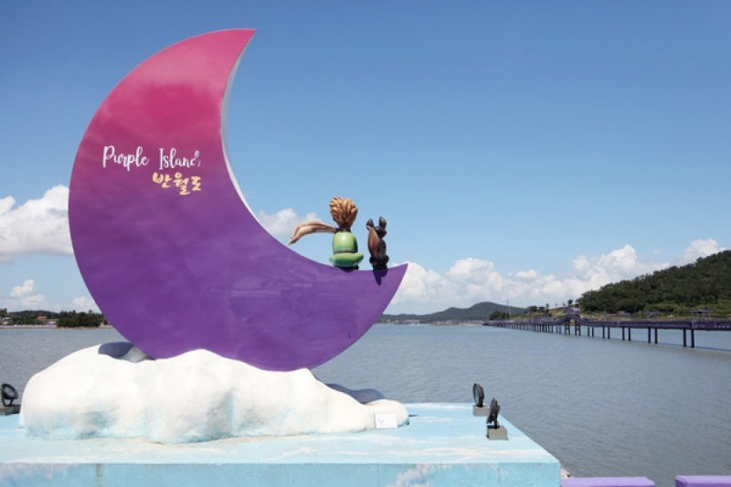 퍼플섬의 해상보행로는 약 1.4km. 반월·박지도를 잇는 다리 위에 오르면 난간, 정자, 우체통, 표지까지 한 톤의 보라가 바닷바람과 함께 스며든다.