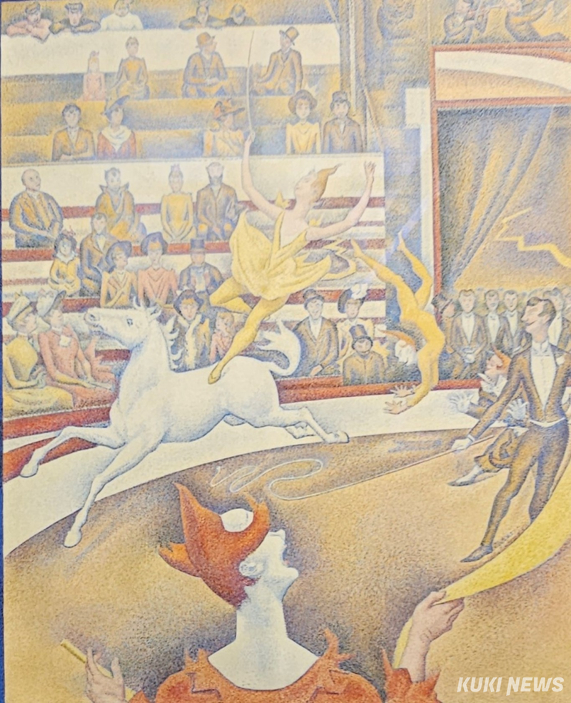 쇠라의 <서커스>는 색채의 과학, 공간의 구조, 사회의 축소판, 그리고 예술가의 마지막 실험이 담긴 복합적 장면이다. 점들은 무대 위에서 빛을 품고, 관객의 눈에서 하나의 환상을 완성한다. 그리고 그 환상은, 예술이 지닌 가장 깊은 진실을 조용히 말해준다. 보는 것이 아니라, 느끼는 것이라고.