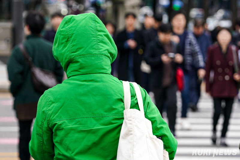 이날 전국 대부분 지역의 아침 최저기온이 한 자릿수로 떨어진 가운데 강풍까지 불어 체감온도는 초겨울 수준이었다. 시민들은 양손으로 옷을 여미거나 따뜻한 음료가 든 잔을 매만지며 출근길에 올랐다.