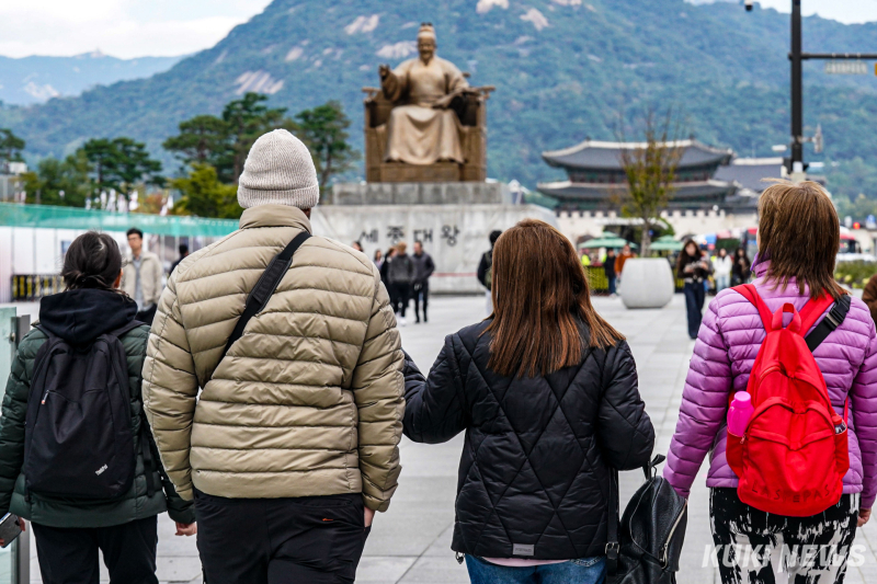 서울 아침 최저기온이 5도까지 떨어진 20일 서울 종로구 광화문광장에서 두꺼운 외투를 입은 시민들이 발걸음을 재촉하고 있다.서울 아침 최저기온이 5도까지 떨어진 20일 서울 종로구 광화문광장에서 두꺼운 외투를 입은 외국인관광객들이 발걸음을 재촉하고 있다.