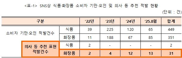 특히 ‘의사 추천’ 표현을 사용한 불법 광고는 화장품 분야에서 급증한 것으로 확인됐다. 식약처는 화장품법 시행규칙 제22조 및 ‘화장품의 표시·광고의 범위 및 준수사항’에 따라 의사·약사 등 전문가가 해당 제품을 지정·공인·추천·지도·연구개발 또는 사용하고 있다는 내용이나 이를 암시하는 광고를 금지하고 있다.