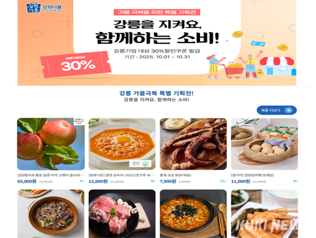 강원더몰은 가뭄 피해로 어려움을 겪는 강릉 지역 소상공인과 입점기업의 판로 지원을 위해 지역 상품을 30% 할인된 가격에 구매할 수 있는 쿠폰을 발행하고 있다.