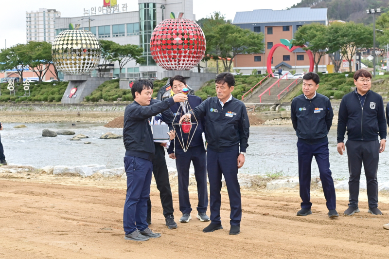 윤경희 군수는 20일 오전 용전천 현장에서 열린 확대 간부회의에서 방문객 편의시설, 체험시설, 주차장, 안전관리 등 전반적인 축제 준비 상황을 점검하며 안전한 운영을 강조했다.