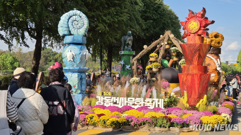 행사장 입구에는 국화꽃과 선사시대 조형물이 설치돼 있었다. 조형물 앞에서는 가족 단위 관람객이 사진을 찍으며 순서를 기다렸다. 붉은 불꽃과 푸른 바다를 형상화한 기둥 아래에는 ‘제30회 강동선사문화축제’ 문구가 선명했다.