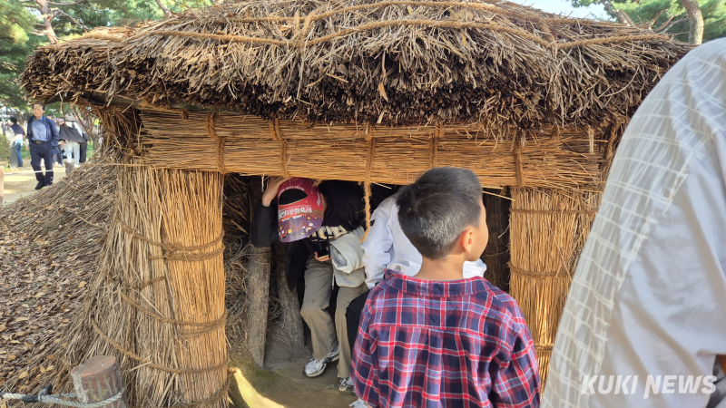 숲속 체험존에는 볏짚으로 만든 움집이 세워져 있었고, 아이들이 안을 들여다보며 “옛날 사람 집이래”라고 말했다.