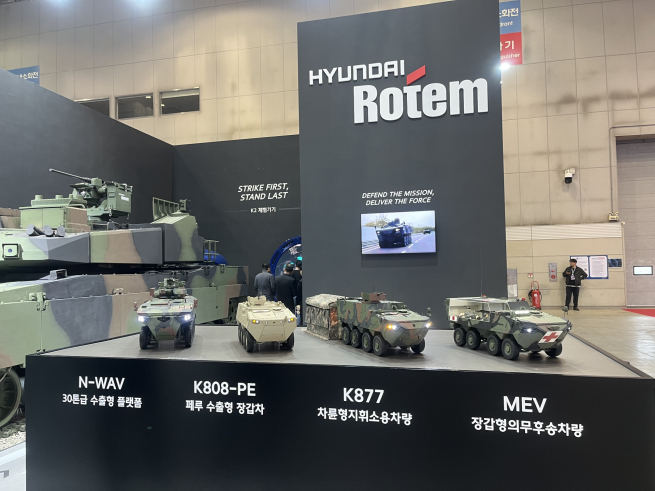 이번 전시회에서 국내 주요 방산 기업들은 AI와 유무인 복합체계를 미래 전장의 핵심으로 제시했다. 현대로템은 전시장에서 AI·수소모빌리티의 대표 전시품으로 수소연료전지 기반 무인 모빌리티 전동화 플랫폼인 ‘블랙 베일(Black Veil)’을 최초로 선보인다. 기존 주력 제품군인 차륜형장갑차에 수소 플랫폼을 장착한 수소 차륜형장갑차도 함께 전시된다. 현대로템은 차륜형장갑차의 수소연료전지 및 전동화 추진시스템 적용기술을 현재 개발 중이며, 의무용 차륜형의무후송차량, 야전 지휘용 차륜형지휘소용차량 등 계열화 모델들은 상용화를 시작한 바 있다.