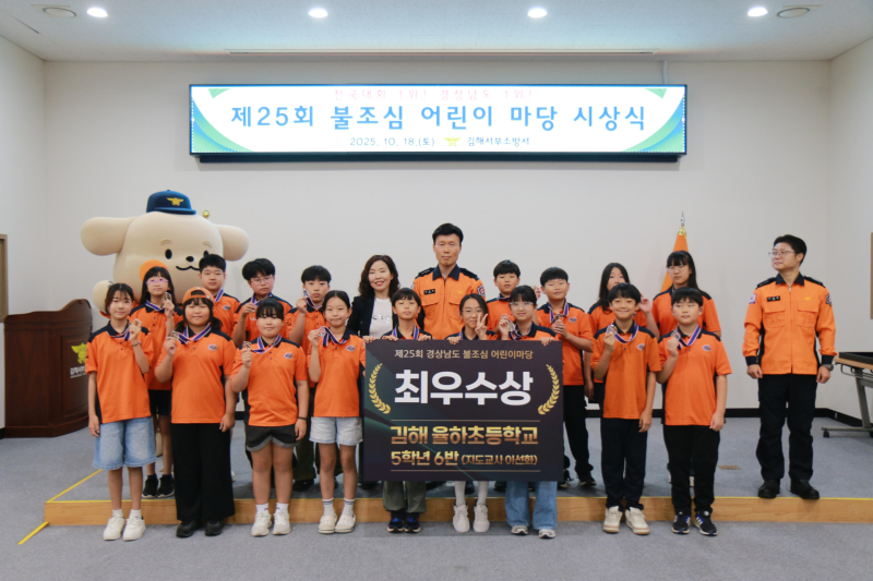 김해서부소방서는 20일 율하초교 5학년 6반 어린이들이 제25회 불조심 어린이마당에서 경남1등, 전국 1등을 수상해 시상식을 개최했다. 이번 대회는 초등학생들이 화재 예방과 안전 수칙을 학습하며 안전 의식을 높이는데 목적이 있다.