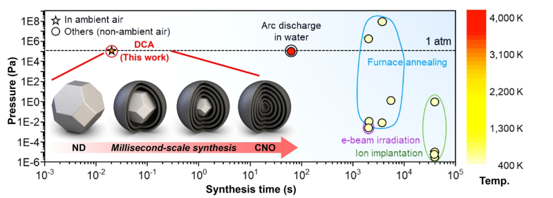 연구팀은 빛을 0.02초 비춰 순간적으로 3000℃ 초고온을 만들어내는 촉매 합성 기술로 단단하고 잘 반응하지 않는 나노다이아몬드를 전기가 잘 통하고 촉매로 쓰기 좋은 고성능 신소재 ’탄소 나노어니언탄소Carbon Nano-onion)’로 바꾸는 데 성공했다.